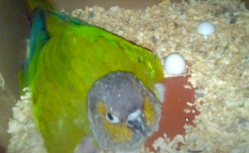 Green Cheek Conure Mother on Eggs